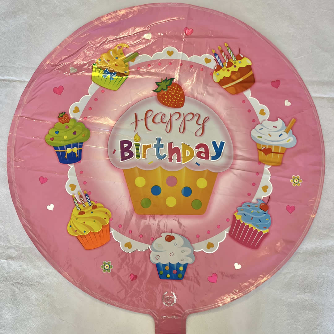 GLOBO FELIZ CUMPLEANIOS ROSA BEBE CON MUCHOS CUPCAKES, 18″, 45 cm, para inflar con aire o con helio
