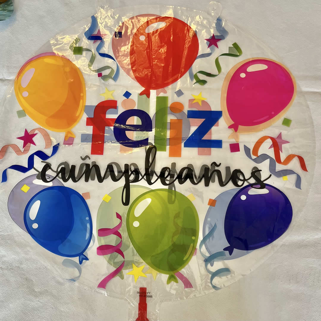 GLOBO FELIZ CUMPLEANIOS TRANSPARENTE CON GLOBOS MILTICOLOR, 18″, 45 cm, para inflar con aire o con helio