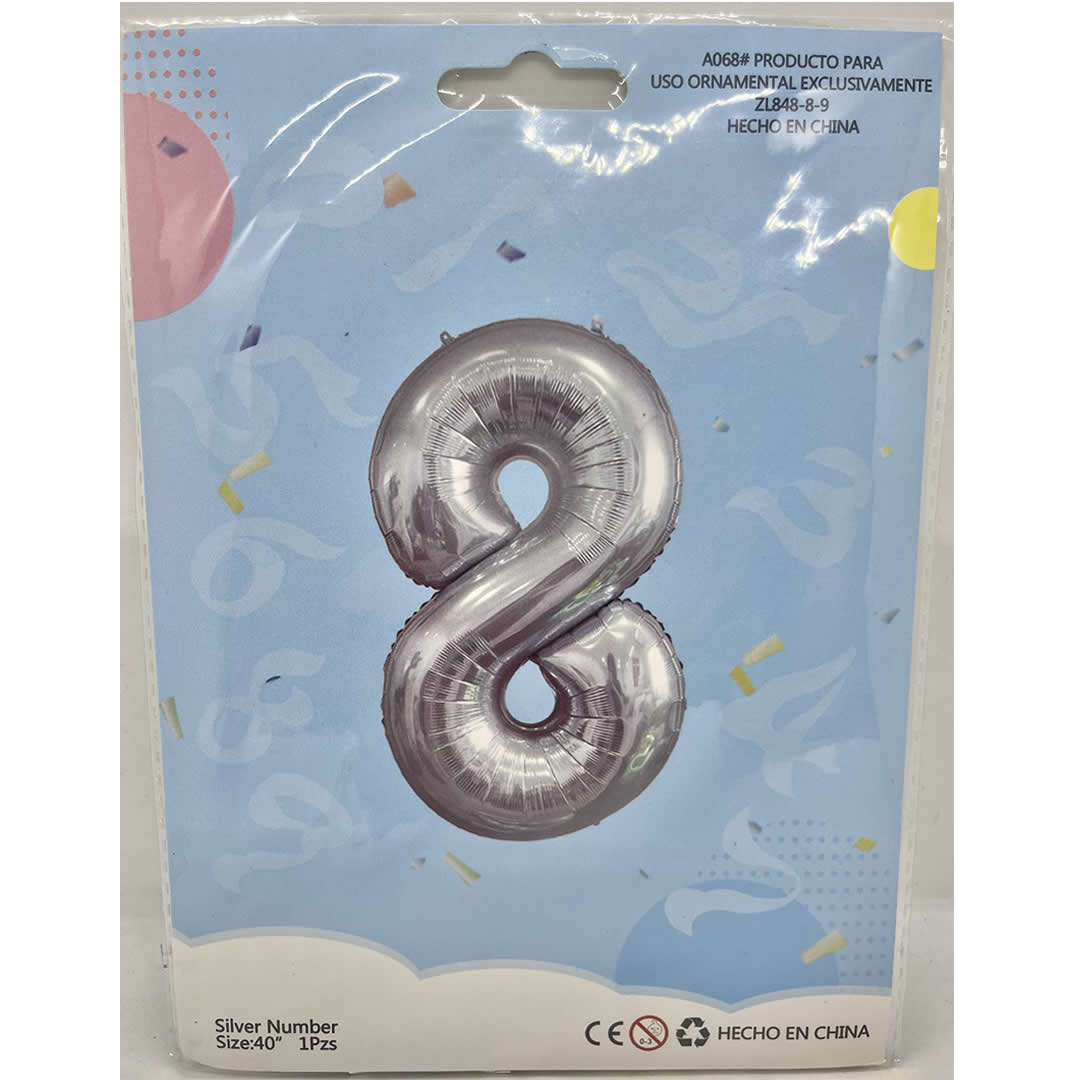 GLOBO NUMERO 8 PLATA 40″, 1 metro, para inflar con helio o aire